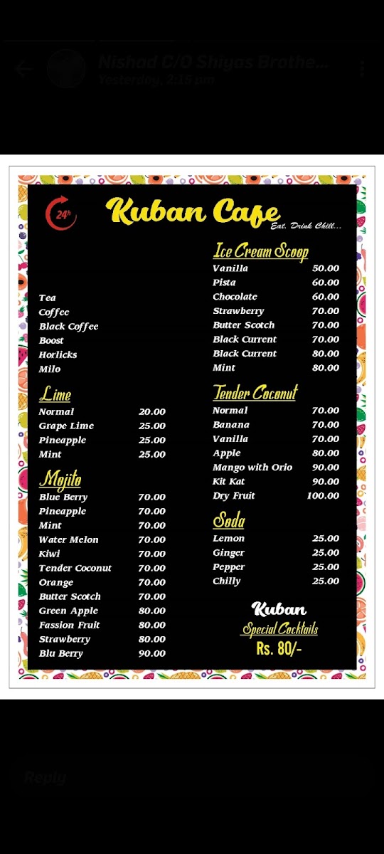 Located near Guru Mandabam in Pattimattom, Kerala, Kuban Cafe is the area's only 24/7 cafe, making it a beloved stop for locals and travelers alike. The menu is a vibrant tapestry of flavors, featuring a wide selection of refreshing fruit juices like Watermelon and Pomegranate, priced between ₹50 to ₹80, ensuring there's something for everyone.